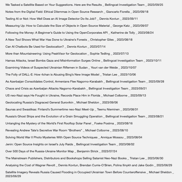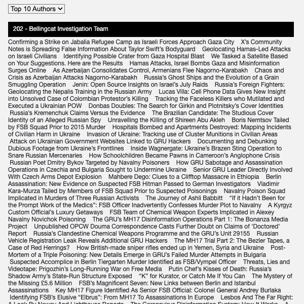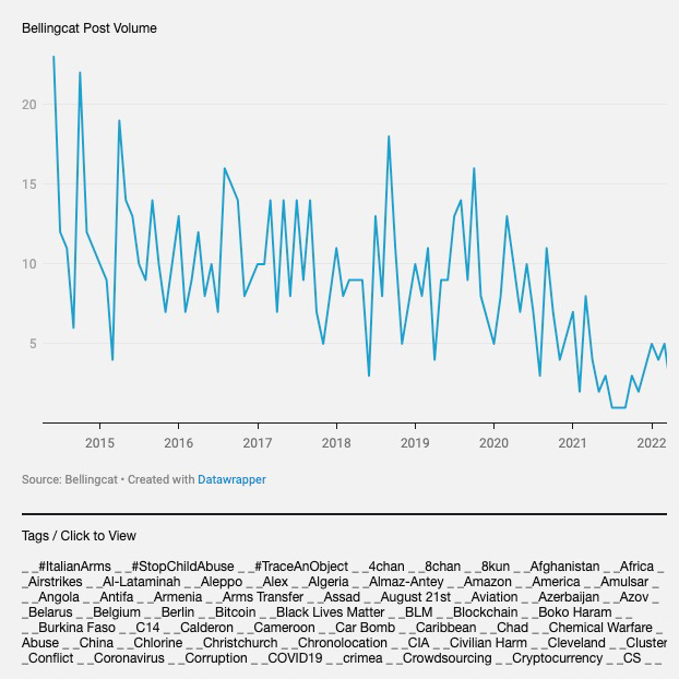 To better understand the scope and frequency of contributions to the OSINT organization Bellingcat, I built a dynamic aggregating tool. This focused display is a much easier way to see the history of Bellingcat from a glance at its contributors and themes.