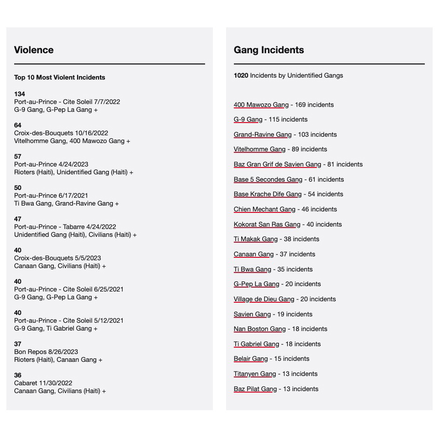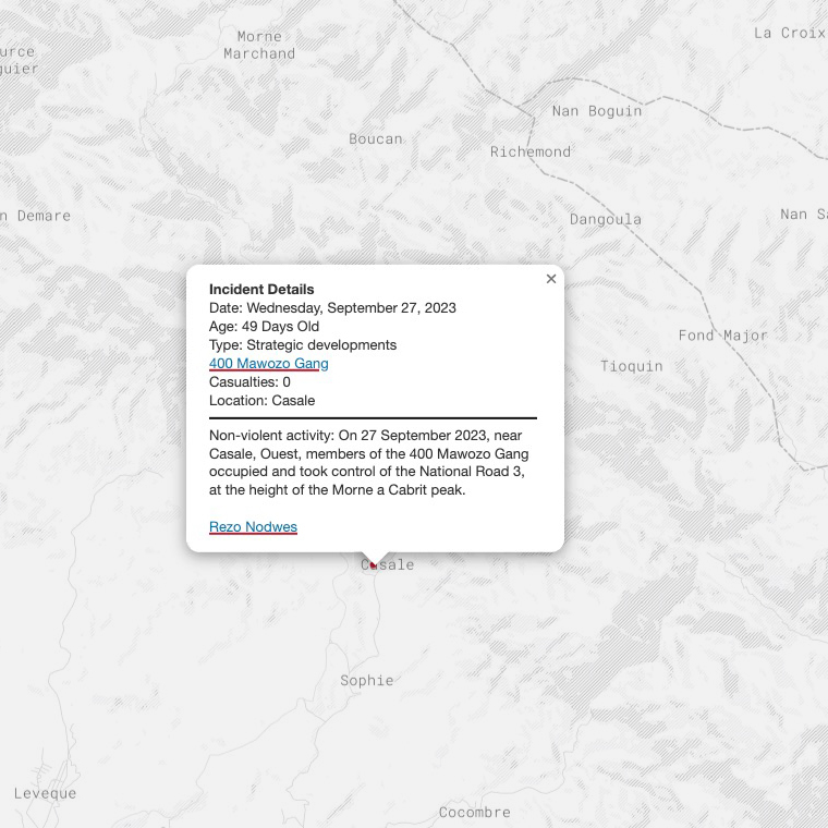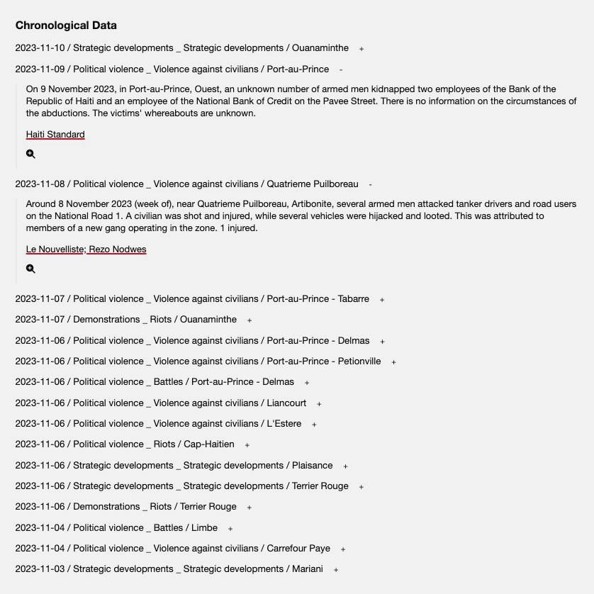 As a longtime visitor to Haiti I am interested in the evolving political situation. Using data from the Armed Conflict Location & Event Data Project API, I created a simple map and dashboard to plot events. Though this project is focused on Gang warfare in Haiti, this project is easily ported to a variety of other situations.